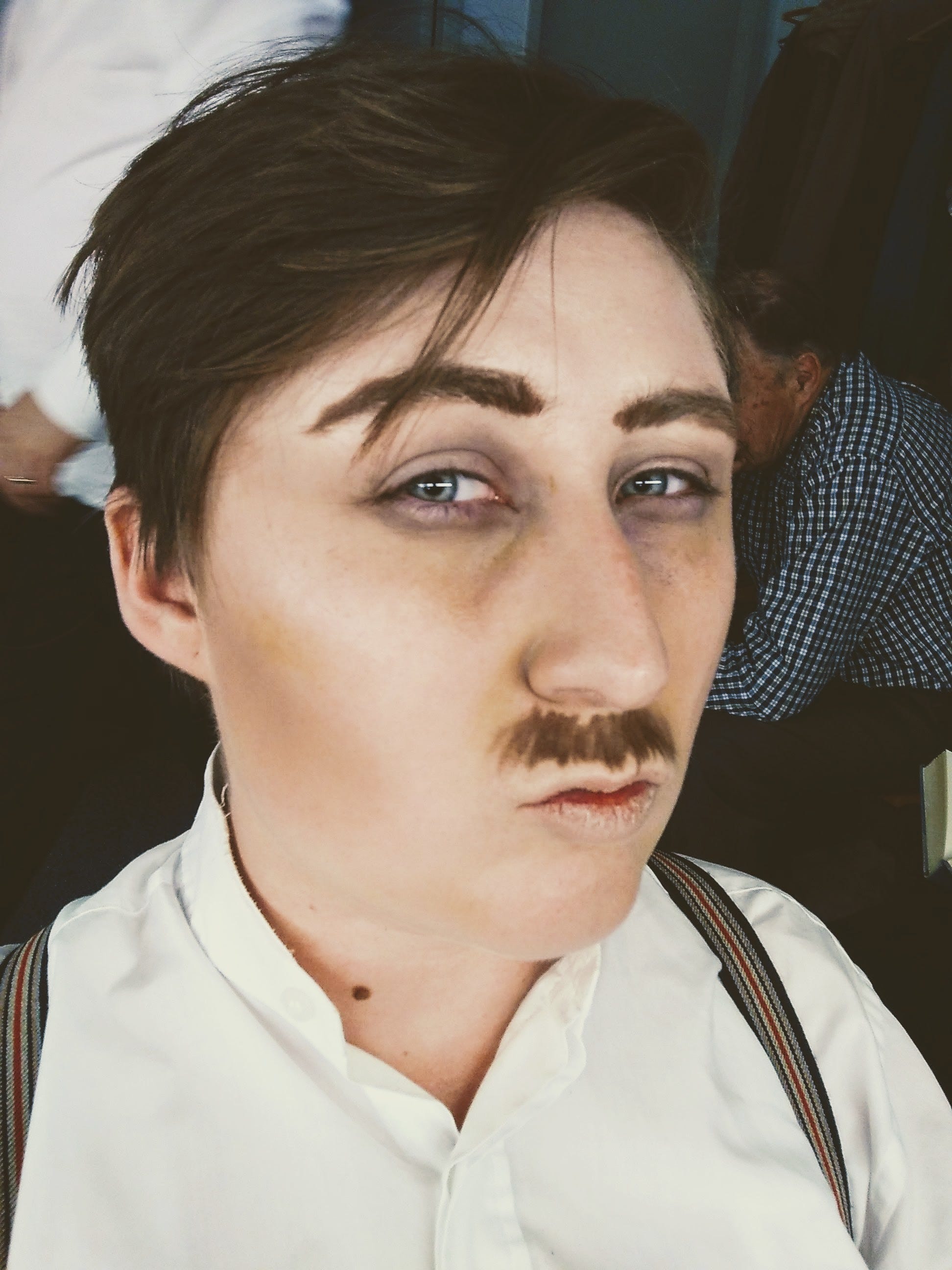 One of the more recent traditions of community theatre is the dressing room selfie. A lot of work by a number of people goes into making actors look good, and we like having our own pictures of the end product to show off. Group selfies are also a great opportunity for cast bonding, as we strike our most fetching or outrageous poses both in and out of character. Some of my favourite pictures of myself show me in male costume—I particularly like the ones of me as Mr Spenalzo (deceased) from Arsenic and Old Lace. I mean, sure, my skin lacks the lustre of the living and my eyes appear to have sunken back into my skull. I am supposed to be playing a dead man, after all. But I have a face that suits facial hair, even when it’s drawn on my face in eyebrow pencil[9]. And the real hair on my head looked fantastic. The play is set in the early 1940s, and since I had no other hair-related commitments I got it cut into a suitable pre-WWII men’s style: short back and sides, and a side part on top (similar to the hairstyle Cary Grant had in the film). As Mr Spenalzo I was not going to be onstage for very long, and the lights were off the whole time I was out there, so the hair was not especially necessary (nor the moustache). However, I never miss a chance to do something new and interesting with my hair (or draw a moustache onto my upper lip).