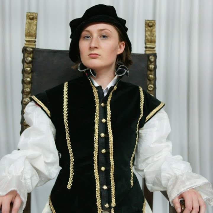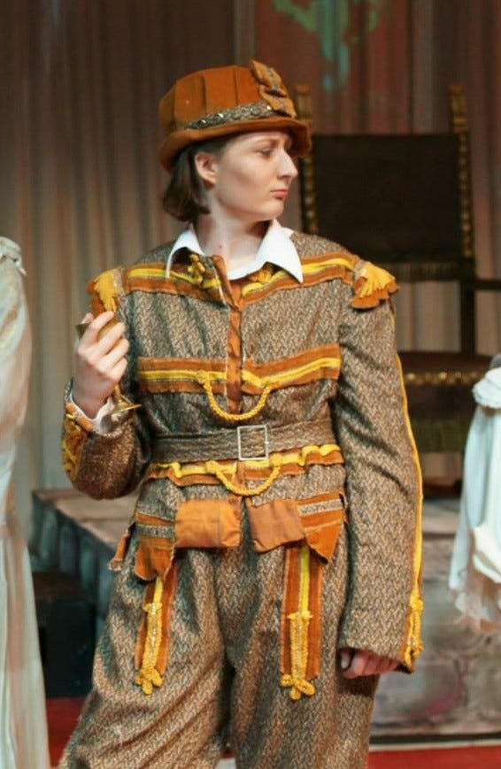 I began playing male roles in high school drama: we only had one boy in the class for the last two years, so quite a few of us donned trouser roles out of necessity. I was also the go-to student for token adult roles (the mothers, the teachers, the middle-aged laudanum addicts), which is more flattering to my acting ability in retrospect than it seemed to be at the time. When I started getting involved with community theatre after high school, I expected to shift from playing almost exclusively blokes and women two or three times my age to acting as nothing but young ladies. I was partially correct. I started getting cast in more female roles, for sure, and the characters were not significantly older than I was[7]. Perplexingly, however, the trouser roles continued. I didn’t think much of it when I was cast as a male soldier for the second half of Julius Caesar—in the first half of the play I was playing women, and the second half is entirely set on the battlefield, so anyone who could be a soldier was drafted. A few years later, that same director handed me a whole bevy of blokes to play in Richard III, and thus my reputation as a cross-dressing actor was born.